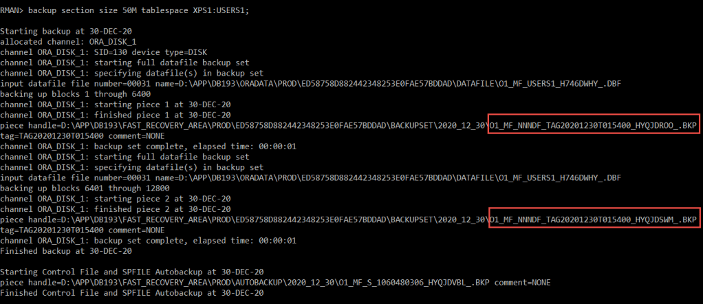 RMAN can optionally break up large files into sections and back up and restore these sections independently. This feature is built into RMAN. You can use it by creating multisection backups, which break up the files generated for the backup set into separate files. This can be done for backup sets and image copies.