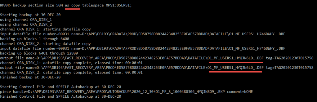 — (Note that in this case and although of using 2 channels [parallel=2], but the final output is one backup piece , as this is an image copy)