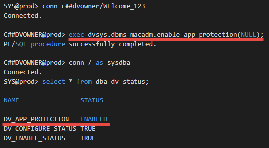 Let us have a quick demo to show you how to enable/disable the Database Vault Operations Control at the CDB level and how it impacts the power users access to the business data at the PDB level, even in the case of Database Vault is not enabled at the PDB level.
