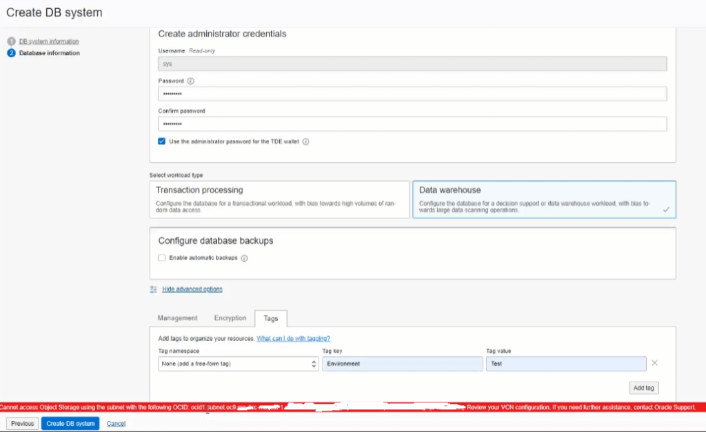 and after passing all the required information, and then clicking “Create DB System”, I received the following error: