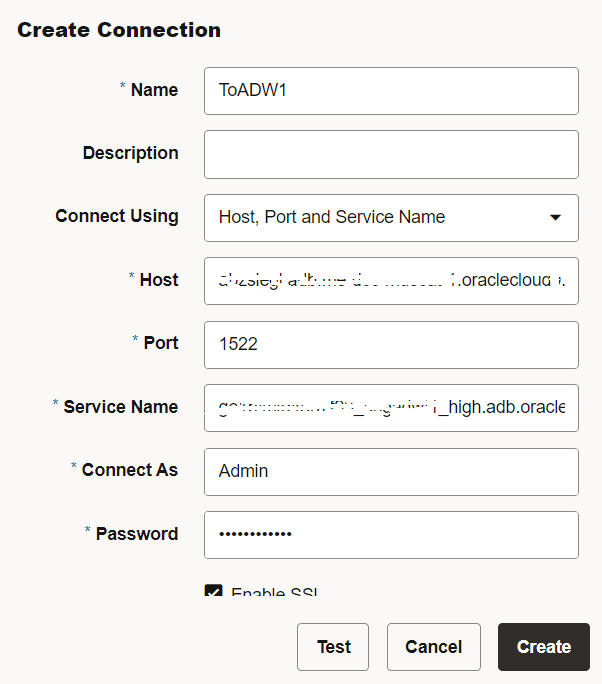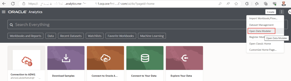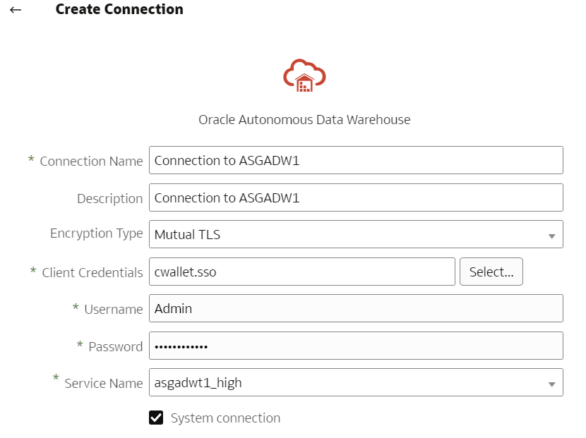 I login to the Oracle Analytics Cloud (OAC), and I successfully created a database connection to the Autonomous Data Warehouse database on the same tenancy (Clicked on the “Create” button then Connection”: