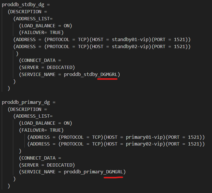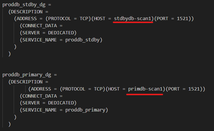 If you are using the scan name on the above connect strings proddb_stdby_dg & proddb_primary_dg, you don’t need the static listener entries that ends with _DGMGRL (they should be removed, if exist).