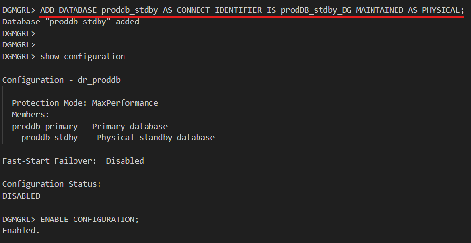 DGMGRL> ADD DATABASE proddb_stdby AS CONNECT IDENTIFIER IS prodDB_stdby_DG MAINTAINED AS PHYSICAL;