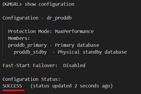 Configuration “dr_proddb” created with primary database “proddb_primary”