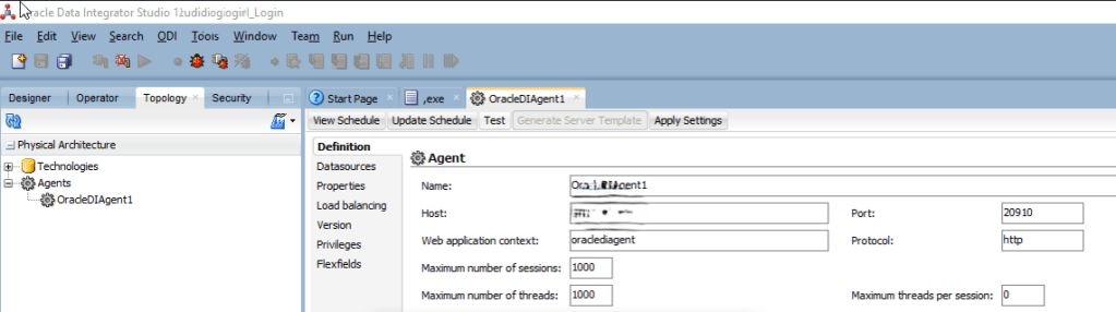 Connect to the ODI Studio, create connection to the ODI database, and then create new agent: