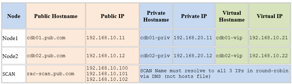 • Both public and VIP hostnames should be resolvable in DNS for best management, while private IP hostnames may reside in /etc/hosts.